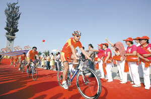 | ↑11月11日上午,参加2008环海南岛国际公路自行车赛的中国国家队受到在场观众的热烈欢迎。 |