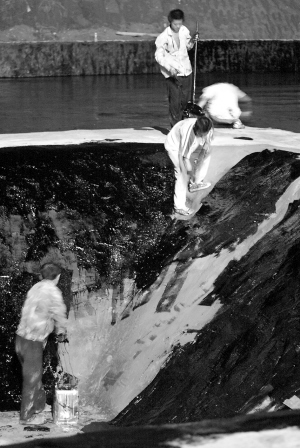 记者在现场看到,数十名工人正在挑灯夜战,用一种类似沥青的黑色防水材料铺设地下室防水层,一股难闻的臭味扑鼻而来。据工地有关人士说,地下室防水工程是从今天开始施工的,估计要搞两天左右。他们用的防水材料是聚胺脂,是经国家检测合格的产品。
