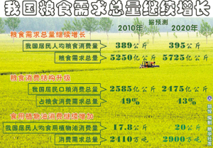 据新华社北京11月13日电 《国家粮食安全中长期规划纲要》指出,为了满足我国粮食需求总量的继续增长,我国力争到2020年,确保耕地保有量不低于18亿亩,基本农田数量不减少、质量有提高。 我国将努力稳定粮食播种面积,使全国谷物播种面积稳定在12.6亿亩以上,其中稻谷稳定在4.5亿亩左右。在保证粮食生产的基础上,力争油菜子、花生等油料作物播种面积恢复到1.8亿亩左右。