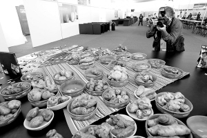 | 11月16日,在秘鲁首都利马的亚太经合组织(APEC)领导人第16次非正式会议国际新闻中心,一名记者在拍摄展出的不同品种的土豆。秘鲁人认为本国是马铃薯的原产地。在此次APEC会议期间,秘鲁农业部在APEC国际新闻中心设置了一个展区,向来自世界各地的记者们展示数十个土豆品种。