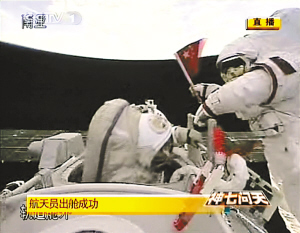 进入太空,翟志刚用右手接过刘伯明递来的五星红旗,一面航天人绣成的硬挺的五星红旗。记者问道,为什么没有用常用的丝绸做的国旗?翟志刚说,因为太空没有空气没有风,担心红旗展不开,飘扬不起来。