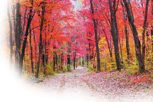 榆树沟往桃源方向的乡道,路上车不多,如果时间闲暇,徒步是不错的选择。路两旁树木种类繁多,有阔叶林,针叶林,针叶混交林,岳桦林,还有藤类蕨类植物,由于不同树种对霜冻的反应不一样,有娇媚的橘红,有沉稳的暗红,有华丽的艳红,有粉嫩的菲红,各种各样的红,颜料也不一定能调出来的色彩。桦树象金币一样的黄灿灿的叶子,风起时,扑拉扑拉晃着金光,松针树叶毛绒绒地冒着嫩嫩的鹅黄,还有依然碧绿的,根本不理会霜冻的松林,这一切,应接不暇地全倒进你的眼睛里,仿佛一头撞进了童话的世界里,变成了艾丽丝,开始梦游起来。