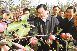 | 胡锦涛在安塞县沿河湾镇方塔村苹果园同果农们一起摘苹果,分享丰收的喜悦。 新华社发 |