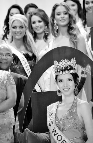 11月17日,2007年世界小姐、来自中国的张梓琳(前)与参赛佳丽合影。来自世界100多个国家和地区的112名佳丽齐聚约翰内斯堡,准备参加于12月13日举行的2008年世界小姐全球总决赛。 新华社发
