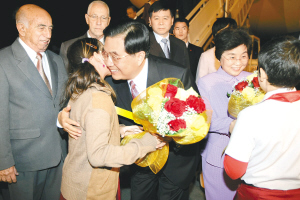 | 在哈瓦那何塞·马蒂国际机场,胡锦涛和夫人刘永清受到古巴国务委员会第一副主席兼部长会议第一副主席马查多(左一)等的热情迎接。这是胡锦涛和夫人亲切拥抱献花的古巴少年儿童。 新华社发 |