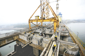| 南水北调丹江口大坝施工现场(11月15日摄)。因南水北调工程需要,丹江口水库大坝由原来162米加高到176.6米。
