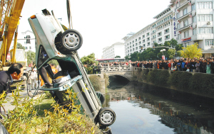 11月19日,坠河出租车被吊起。 当日上午11时许,苏州一辆出租车途经干将路时,在撞倒河边两棵小树后,坠入干将河,造成1死1伤。目前有关部门正在调查事故原因。 新华社发