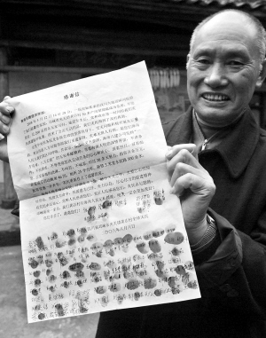 记者看到,这两份用A3白纸打印的感谢信中写满了感激之词,落款是2008年8月8日,信后附有上百名村民的签名和按下的指印。