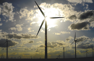 这是已经部分建成的锡林郭勒盟辉腾梁风电场(摄于2008年6月23日)。 随着一批新的风力发电项目建成运行,至2008年10月底内蒙古已投产的风力发电机组总规模达到205.68万千瓦。 新华社记者 任军川 摄