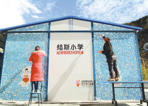 志愿者在四川小金县结斯小学活动板房上进行装饰绘画(10月29日摄)。 由共青团南昌市委和南昌市志愿者协会共同推出的“彩虹小屋”援川志愿者行动近日圆满结束。 新华社发(阎志强摄)