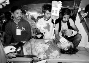 ←医护人员把爆炸中受伤的人送往医院。 新华社/法新