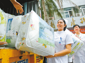 | 11月20日,海南省妇产科医院全体职工向汶川地震灾区捐赠了100床新棉被。