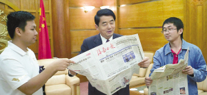 | 这是我国驻越南大使胡乾文(中)在使馆内接受本报记者采访后,阅读本报有关越南与海南合作相关报道时的情形。 本报记者 王军 摄 |