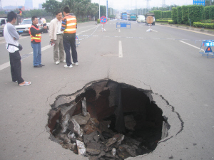 海口市排水管道养护所接到记者的报告后,立即派人赶到现场进行检查。该所设施室主任黎军向记者介绍,丘海大道机动车道上的掏空地坑面积为7米×5米,地下水沟为片石方沟,口径为1.1米×1.1米,用于排放雨水,是1993年丘海大道建设时同期修建的。2005年丘海大道路面改造时,部分排雨水沟没有重新铺设新管道,现在出现问题的正是旧管道。