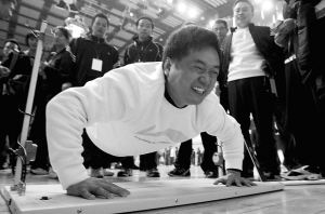 11月21日,一名公务员正在参加俯卧撑测试。 当日,浙江省第二届公务员体能测试比赛在杭州西湖体育馆举行,300余名公务员参加了肺活量、俯卧撑、坐位体前屈、绕杆跑等项目的测试。 新华社发
