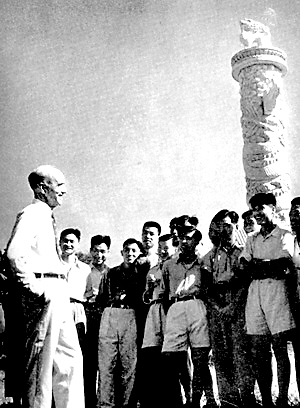 | 司徒雷登(左一)与1946年入学的燕大新生在一起。 |