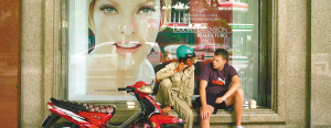 | ↑ 胡志明市街头,完全西化的商品橱窗前,当地生活的西方人和摩的司机言谈甚欢。胡志明市素有“法国小巴黎”之称,在这个时尚的城市里,身为当地人的摩的司机,反而给人一种外来者的错觉。 |