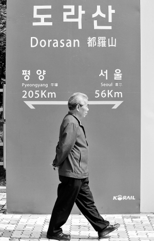 | 这张9月12日在韩国北部京畿道坡州市都罗山车站拍摄的资料照片显示的是一名男子走过标有该站至首尔和平壤火车行车距离的标牌。 新华社/法新 |