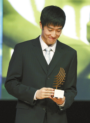 11月24日,2008年国际田联年度最佳选手颁奖仪式在摩纳哥举行。中国男子110米栏运动员刘翔2006年表现突出,获得最佳表现奖,而当年因故未能参加颁奖典礼,所以在今年的颁奖典礼上才收到这座“迟到”的奖杯。图为刘翔在颁奖仪式上欣赏2006年度最佳表现奖奖杯。 新华社发