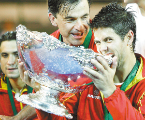 | ← 西班牙队队员贝尔达斯科(右)在戴维斯杯颁奖仪式上品尝奖杯。