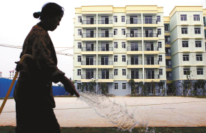上图:11月24日,刚竣工的海口民安小区,清洁工人正在为新种下的草皮浇水。该小区是海口第一个利用政府储备地进行廉租房建设的项目。上个月底,已经有部分城市低保户领到了新房的钥匙。