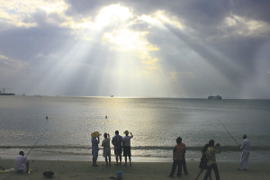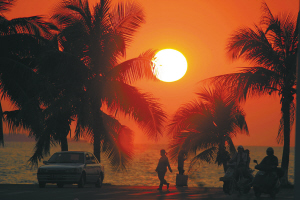 鹿城变幻的自然景观,一天一种情调,让人百看不厌,令人留连忘返。尽管北国已冰天雪地,但三亚的自然景色,还是在暖阳下梦幻多变,令人心动,让人不由得想起电视连续剧《渴望》的主题歌来: 故事不多,宛如平常一段歌,过去未来共斟酌…… 上图:三亚湾一抹夕阳,映照真诚的生活。 左图:霞光下的三亚湾,亦真亦幻,南来北往的人们各有各的休闲方式。 右图:傍晚休闲的家庭,诉说着悠悠岁月的真情。 特约记者 孙清 摄