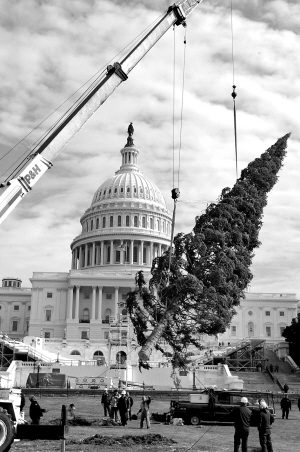 | 十一月二十四日,在美国首都华盛顿,工作人员借助起重机将圣诞树栽种在国会门前。这棵圣诞树高达约二十一米。 新华社/路透 |