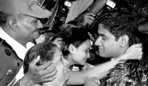 11月24日,在印度孟买国际机场,获释印度船员桑托什·帕蒂尔(右一)接受家人问候。帕蒂尔所工作的化学品货轮2个多月前遭索马里海盗劫持。据称在收到110万美元的赎金后,海盗释放了船上18名印度籍船员。帕蒂尔和其他3人当天顺利返回印度。 新华社/法新