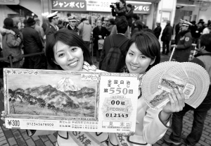 临近年末,成千上万的日本人前往彩票销售柜台购买彩票,期望博得3亿日元(约合2100万人民币)的年终巨奖。 新华社/法新