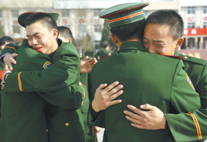 11月25日,退伍老兵与战友在部队驻地拥抱告别。 当日,武警宁夏总队在银川火车站举行退伍老兵欢送仪式,千余名退伍老兵告别军营,告别战友,踏上返乡的列车。 新华社记者 王鹏 摄