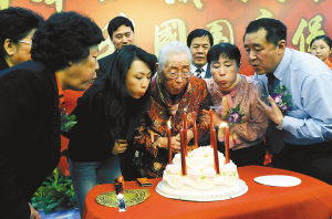 11月26日,严仁英教授(中)在庆典仪式上与亲人和弟子一起吹灭生日蜡烛。 当日,北京大学第一医院在北京为我国著名妇产科学家、中国围产保健之母严仁英教授举行95岁寿辰暨从医68周年庆典。医学界、教育界的上百名专家、学者纷纷前来祝贺。 新华社记者 王呈选 摄