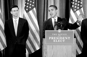 | 11月25日,美国当选总统奥巴马在芝加哥召开的新闻发布会上正式提名彼得·欧尔萨格(左)出任白宫行政管理和预算局局长。欧尔萨格现年39岁,现任美国国会预算局局长。 新华社/路透 |