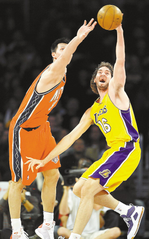 | 易建联(左)与湖人队球员加索尔(右)拼抢。 新华社发