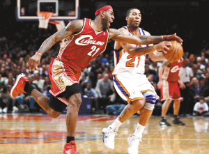 | 11月26日,在NBA常规赛中,克里夫兰骑士队客场以119比101战胜纽约尼克斯队。图为骑士队詹姆斯(左)在比赛中抢断。 新华社发 |