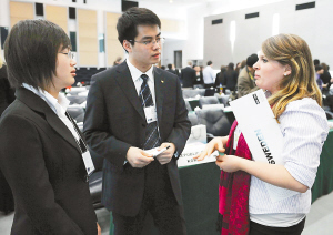 11月25日,学生代表在模拟联合国大会上交流。 当日,美国大学生会议协会和西北工业大学联合举办的2008纽约国际模拟联合国大会西安分会在西安举行,中外44所高校的200多名大学生代表就国际热点问题模拟召开联合国会议。 纽约国际模拟联合国大会是一项大学生的国际交流活动,致力于教育学生了解不同国家、不同民族的政治、经济、文化、社会发展及利益诉求,培养学生以国际视野关注全球利益,增强国际交往的技能。 新华社发