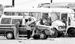 11月28日,在印度孟买泰姬玛哈酒店附近,营救人员隐蔽在汽车后待命。 新华社记者 王晔 摄