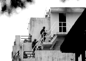 在发动袭击的恐怖分子所藏身的3处主要地点,泰姬玛哈酒店、奥贝罗伊酒店和犹太人聚居的纳里曼大楼,28日上午都发生了激烈枪战。