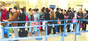 | 11月29日,首批46名上海滞泰旅客在上海浦东机场办理入境手续。新华社发(陈涛摄) |
