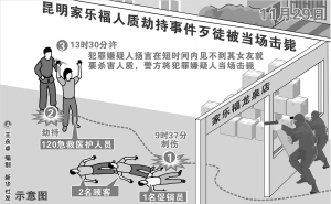 据昆明市公安局新闻发言人通报,29日9时37分,一男子手持匕首闯入家乐福龙泉店,突然持刀刺伤2名顾客及1名促销员,随后将一名赶赴现场救治伤者的120急救医护人员劫持。