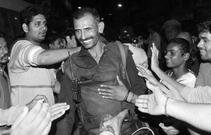 | 28日,当地百姓向一结束行动的印度突击队员(中)表示祝贺。 新华社/路透 |