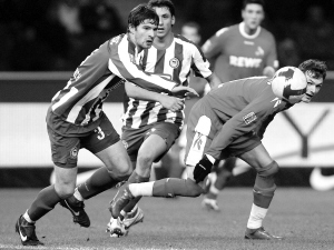 11月29日,在德甲联赛第15轮比赛中,柏林赫塔队主场以2比1战胜科隆队。 柏林赫塔队球员弗里德里希(左)与科隆队球员诺瓦科维奇拼抢。 新华社发