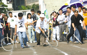 | 海口市民在人民广场参加趣味活动。
