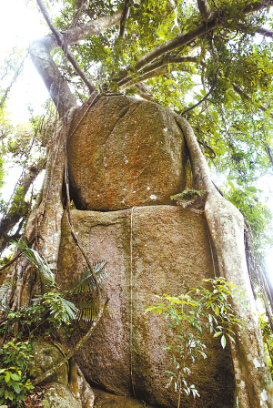 古树可成仙,奇石亦有灵。霸王岭的石头也非常有特点,它们与古木、古藤一起生长,在石上堆砌出阵阵绿意,无情的石头也多情起来。霸王岭上有处三叠石的奇观:巨石摞着巨石,高10多米,更巧妙的是,从巨石相摞的石缝间长出一株榕树来,榕树又生出许多粗壮的根将三块摞在一起的巨石紧紧抱住,看似摇摇欲坠的巨石竟然纹丝不动。