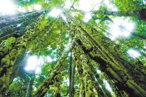 | 霸王岭热带雨林里生长的藤,悬挂在高大树干上,酷似少女的辫子。 |