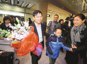 | 11月30日,从泰国返回北京的中国公民黄忠(左二)走出机场。