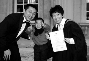 | 11月30日,邓亚萍在英国剑桥大学参加毕业典礼,并获得剑桥大学颁发的博士学位证书。图为邓亚萍获得博士学位后接受丈夫和儿子的祝贺。