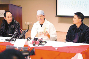 | 北京时间12月6日凌晨,为刘翔主刀的克兰顿医生(中)在赫曼纪念医院召开新闻发布会,对刘翔的伤情,手术情况及术后恢复做出了具体解读。参加发布会的还有田管中心副主任冯树勇(右),和刘翔教练孙海平(左)。 小新发 |