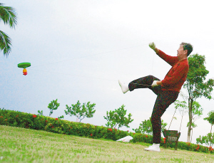 | 一位候鸟老人在三亚湾玩空竹。 |