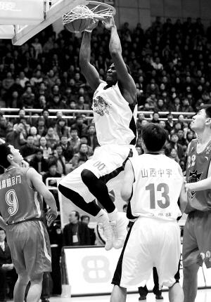| 12月7日,在CBA联赛第十轮比赛中,山西中宇队主场以119比98战胜辽宁盼盼队。图为山西队外援奥德杰(上)扣篮。