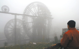 大雾笼罩眉山城 12月8日上午,一名眉山市民在观看大雾笼罩的眉山水车。 当日,四川眉山出现大雾天气。受大雾影响,成(都)乐(山)、成(都)雅(安)高速公路全线关闭,给当地群众出行带来不便。 新华社发(姚永亮 摄)